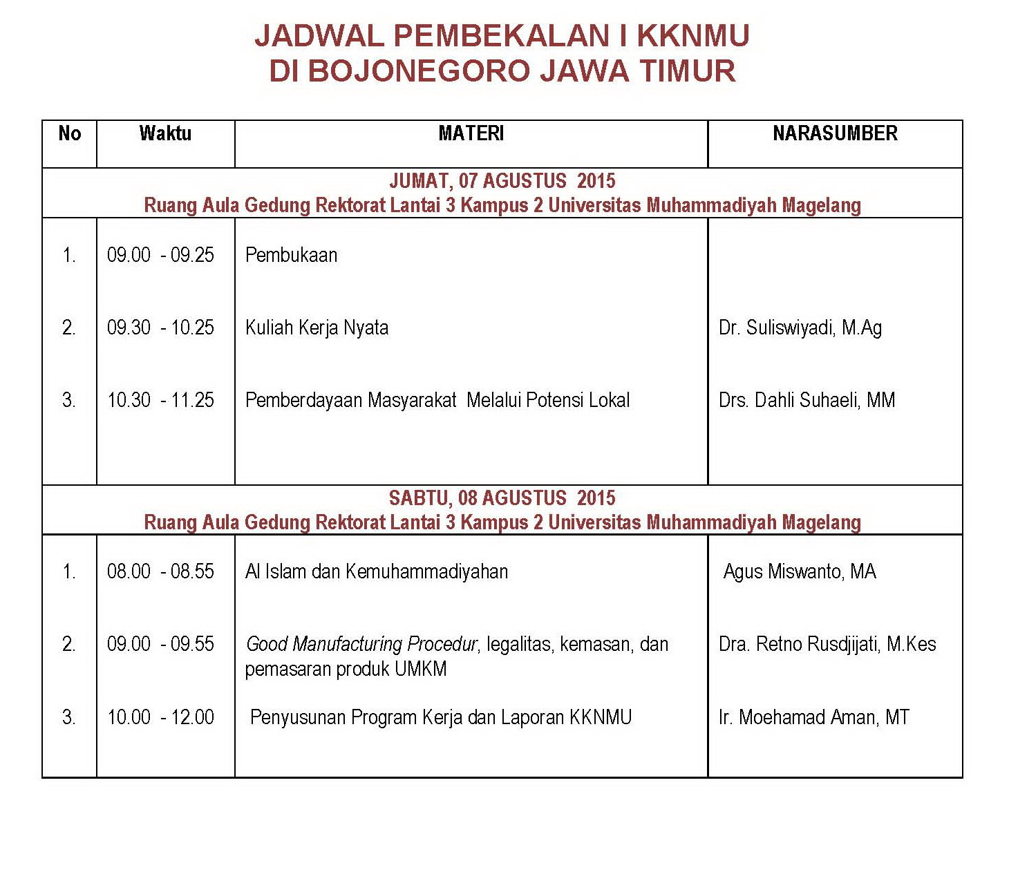 JADWAL PEMBEKALAN I KKNMU TAHUN 2015